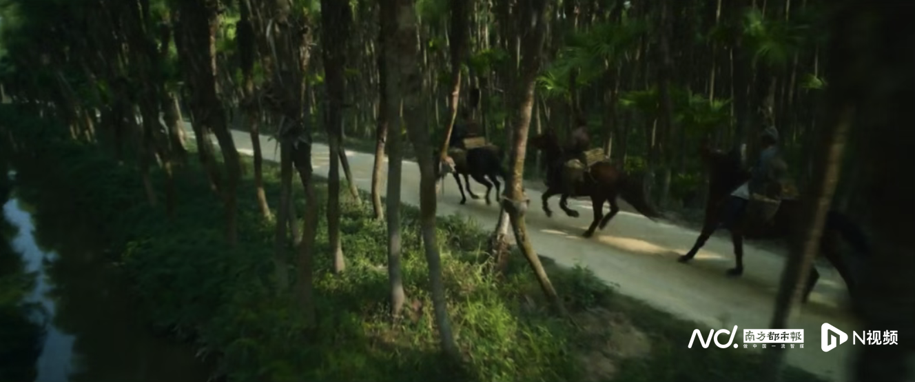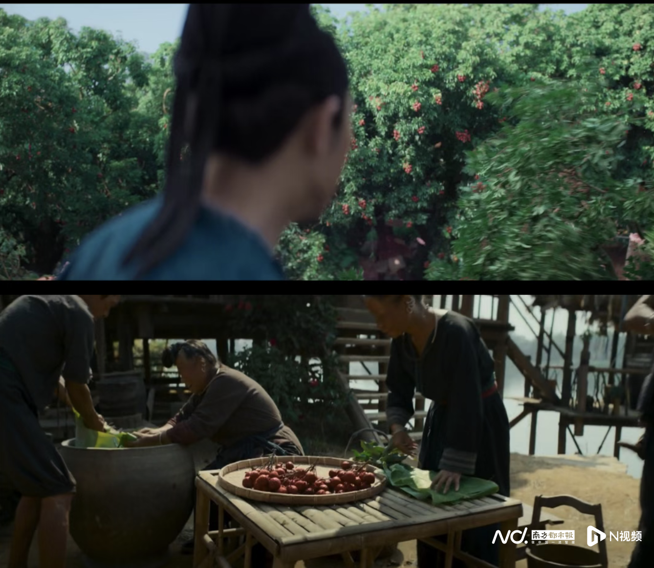 而阳春市岗美镇荔㙟村保持原生态的百年荔枝园更是片中核心场景,导演团队为还原岭南荔枝种植的景象,在河畔搭建起木质房屋,演员身着唐装穿梭林间,搭配古朴秀美的自然风光,仿佛带观众穿越回千年之前。